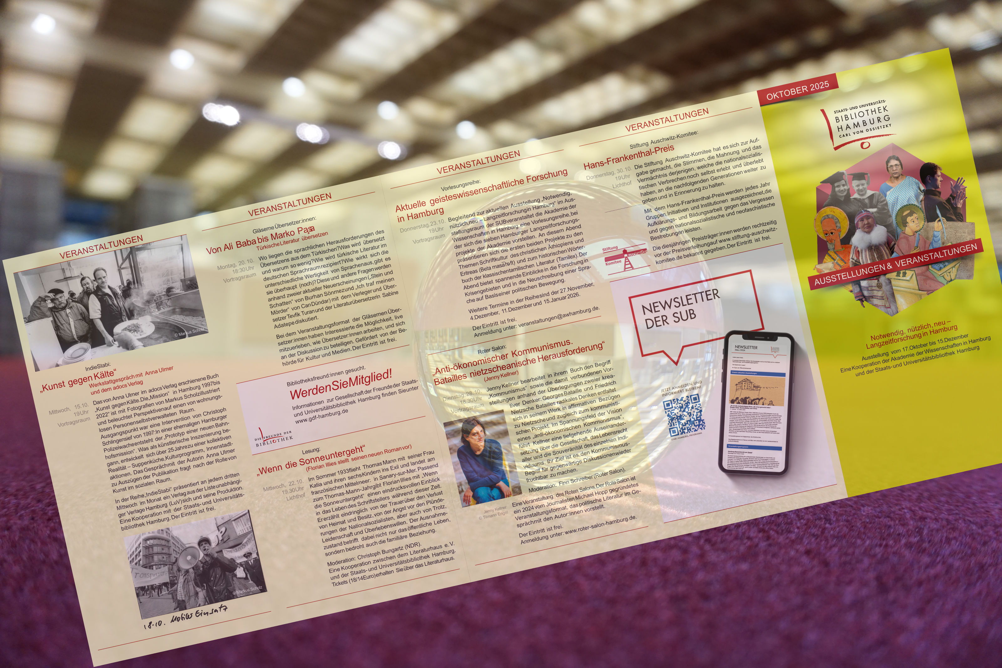 In unserem monatlich erscheinenden Flyer zeigen wir das umfangreiche Veranstaltungsprogramm der Staats- und Universitätsbibliothek Hamburg im Überblick. Sie finden dort die kommenden Vorträge, Konzerte, Lesungen und Ausstellungen. Als gedrucktes Exemplar liegt er im Foyer der Stabi aus und wird an vielen Stellen in der Stadt verteilt. Die neueste Ausgabe mit dem umfangreichen Programm für den kommenden Monat Oktober ist nun eingetroffen. Sie können den Flyer auch bequem auf Ihren Rechner herunter laden: Flyer Oktober 2025 (PDF, 0,9 MB).