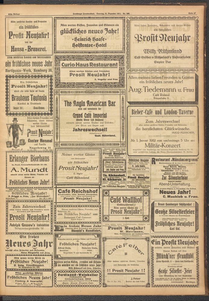 Prosit Neujahr! Diese Neujahrsgrüße erschienen am Sonntag, den 31. Dezember 1911, im Hamburger Fremdenblatt: https://resolver.sub.uni-hamburg.de/kitodo/PPN1699277745_19111231/page/45.